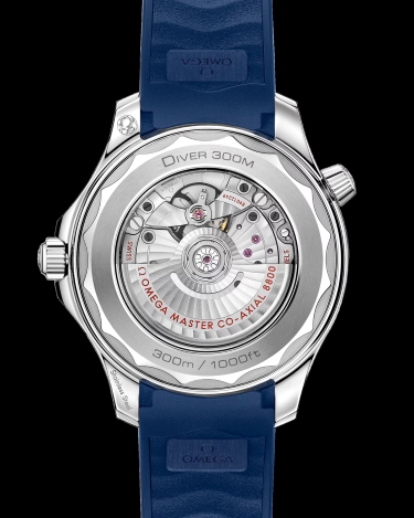 The watch is presented on a blue rubber strap and is driven by the OMEGA Master