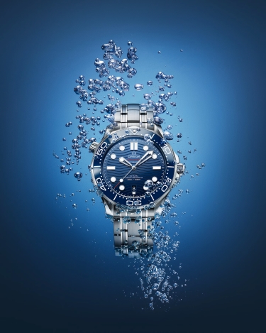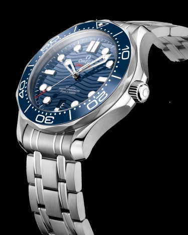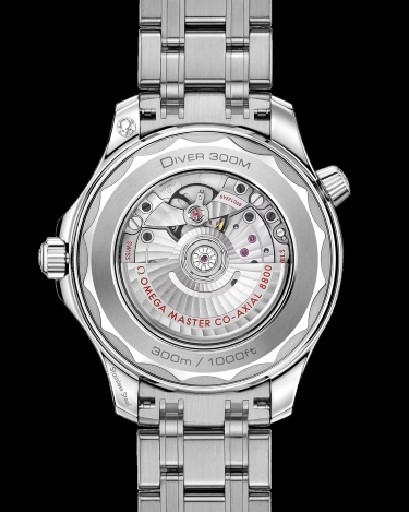 The watch is presented on a stainless steel bracelet and is driven by the OMEGA Master